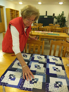 Szebbnél szebb textilekből készültek, pontos méretben. Mivel ajándék takarót fogunk készíteni belőlük, úgy ítéltük meg, meg kell bizonyosodnunk a színtartósságukról is. Ezért este begyújtottuk a fazék alatt a vizet, és sorra megfürösztöttük a blokkokat. Néhányan nem állták ki a próbát, de még időben voltunk.